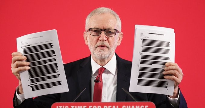 Δύο εβδομάδες πριν από τις πρόωρες βουλευτικές εκλογές, ο ηγέτης του Εργατικού Κόμματος παρουσίασε στους δημοσιογράφους έγγραφα 450 σελίδων που μαρτυρούν έξι γύρους διαπραγματεύσεων από το 2017, στην Ουάσινγκτον και το Λονδίνο, ανάμεσα σε εκπροσώπους των ΗΠΑ και του Ηνωμένου Βασιλείου με θέμα τις εμπορικές σχέσεις των δύο χωρών μετά το Brexit. «Αυτά τα έγγραφα επιβεβαιώνουν ότι οι ΗΠΑ απαιτούν το Εθνικό Σύστημα Υγείας να βρίσκεται στο τραπέζι των διαπραγματεύσεων. Τώρα έχουμε στην διάθεσή μας στοιχεία ότι, με τον Μπόρις Τζόνσον, το NHS θα βρίσκεται στο τραπέζι και προς πώληση». Ο Μπόρις Τζόνσον διαβεβαιώνει ότι η έξοδος από την Ευρωπαϊκή Ένωση, προγραμματισμένη για τις 31 Ιανουαρίου, έπειτα από τρεις αναβολές, θα επιστρέψει στο Ηνωμένο Βασίλειο να ανακτήσει τον έλεγχο επί της εμπορικής του πολιτικής.