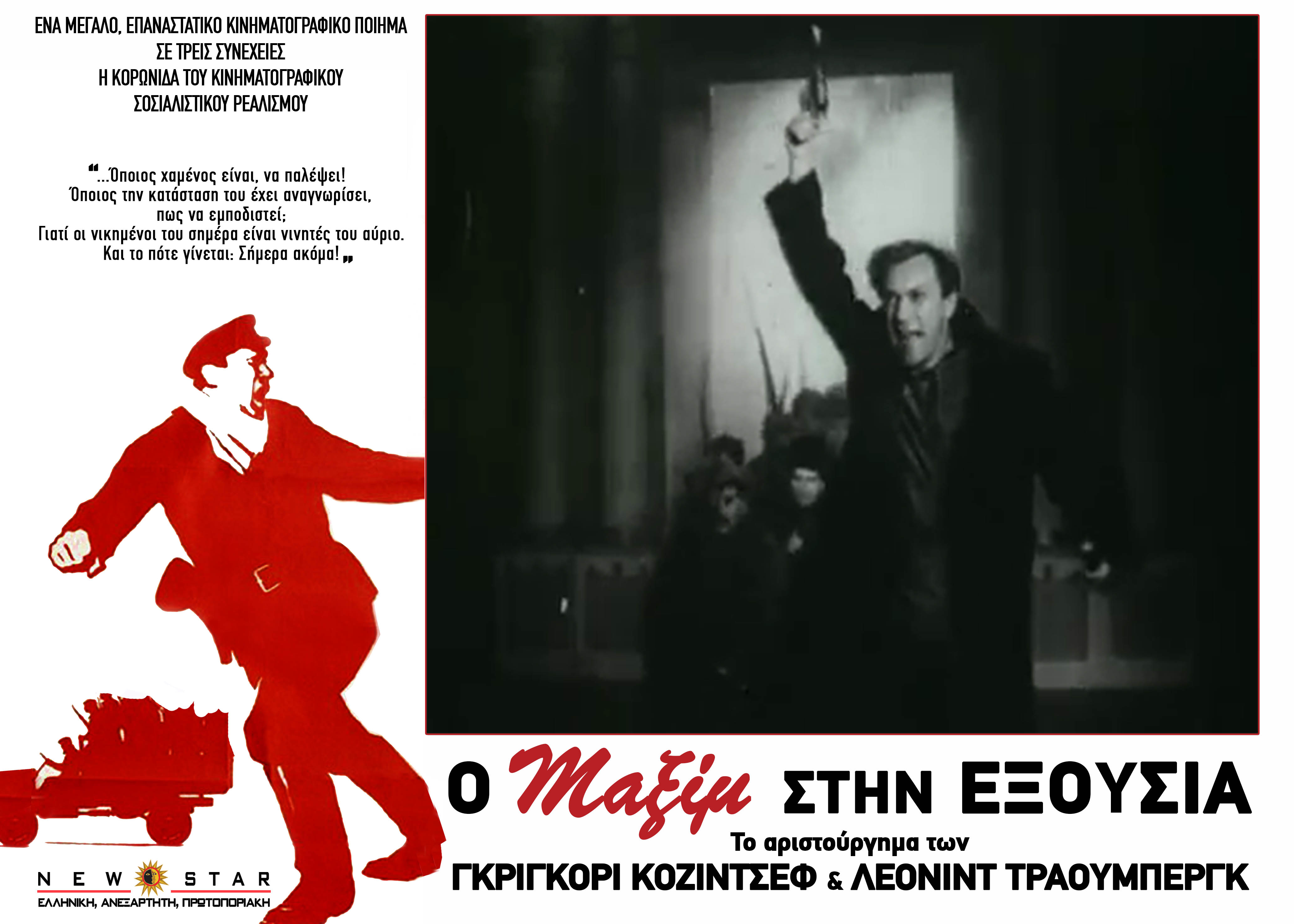 Ο Μαξίμ στην Εξουσία (The Vyborg Side) Σκηνοθεσία: Γκριγκόρι Κόζιντσεφ και Λεονίντ Τράουμπεργκ,Παίζουν: Μπορίς Τσιρκόφ, Βαλεντίνα Κιμπάρντινα, Μιχαήλ Ζαροφ Η ταινία μας μεταφέρει στην Αγία Πετρούπολη μετά την επανάσταση του Οκτώβρη, μέσα από τον ήρωα της τριλογίας, Μαξίμ, δίνοντας την ευκαιρία στους σκηνοθέτες να ανιχνεύσουν τα πρώτα βήματα της νεογέννητης σοβιετικής εξουσίας. Καθοριστικό ρόλο στην ταινία παίζουν και τα επιλεγμένα τραγούδια από τον Σοστακόβιτς, που λειτουργούν σαν υποσημείωση, ενώ η δράση «προσγειώνεται» και «απογειώνεται» όπως περίπου στο μιούζικαλ. |